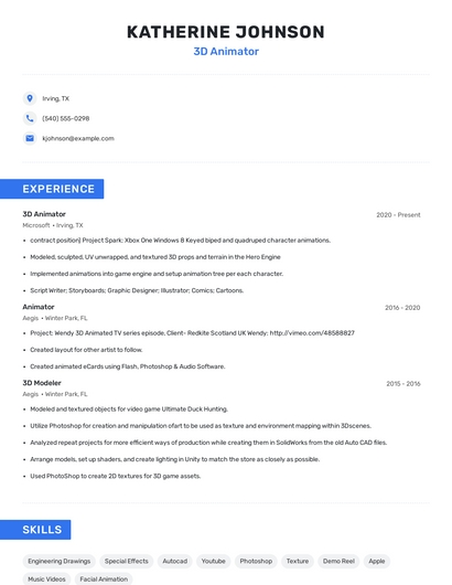 Build a professional 3d animator resume in minutes. Browse through our resume examples to identify the best way to word your resume. Then choose from 5+ resume templates to create your 3d animator resume.