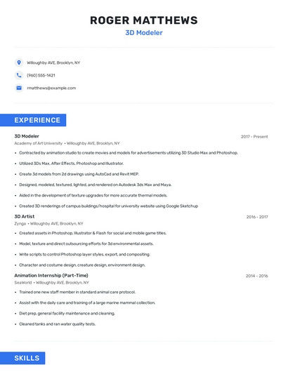 Build a professional 3d modeler resume in minutes. Browse through our resume examples to identify the best way to word your resume. Then choose from 5+ resume templates to create your 3d modeler resume.