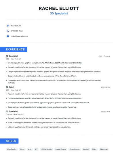 Build a professional 3d specialist resume in minutes. Our AI resume writing assistant will guide you through every step of the process, and you can choose from 10+ resume templates to create your 3d specialist resume.7. Adobe Photoshop