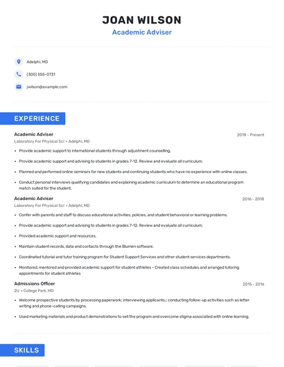 Build a professional academic adviser resume in minutes. Browse through our resume examples to identify the best way to word your resume. Then choose from 5+ resume templates to create your academic adviser resume.