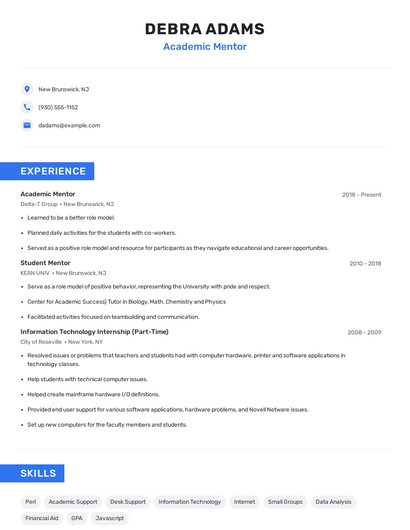 Build a professional academic mentor resume in minutes. Browse through our resume examples to identify the best way to word your resume. Then choose from 5+ resume templates to create your academic mentor resume.
