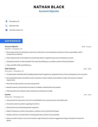 Build a professional account adjuster resume in minutes. Browse through our resume examples to identify the best way to word your resume. Then choose from 5+ resume templates to create your account adjuster resume.