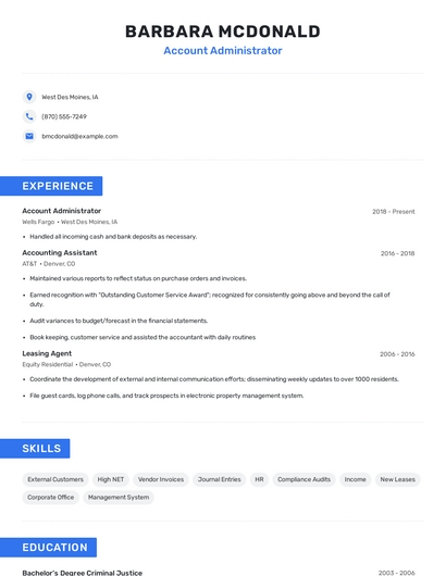 Build a professional account administrator resume in minutes. Browse through our resume examples to identify the best way to word your resume. Then choose from 5+ resume templates to create your account administrator resume.