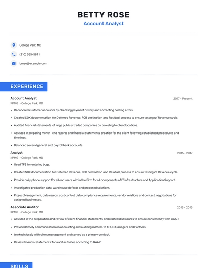 Build a professional account analyst resume in minutes. Browse through our resume examples to identify the best way to word your resume. Then choose from 5+ resume templates to create your account analyst resume.