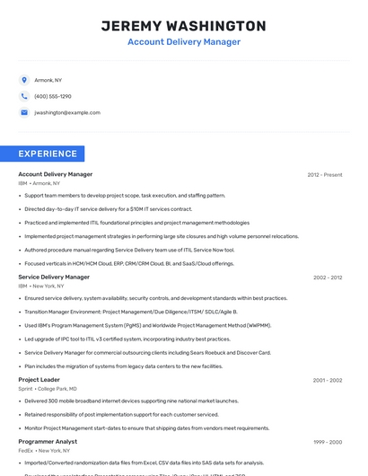 Build a professional account delivery manager resume in minutes. Browse through our resume examples to identify the best way to word your resume. Then choose from 5+ resume templates to create your account delivery manager resume.