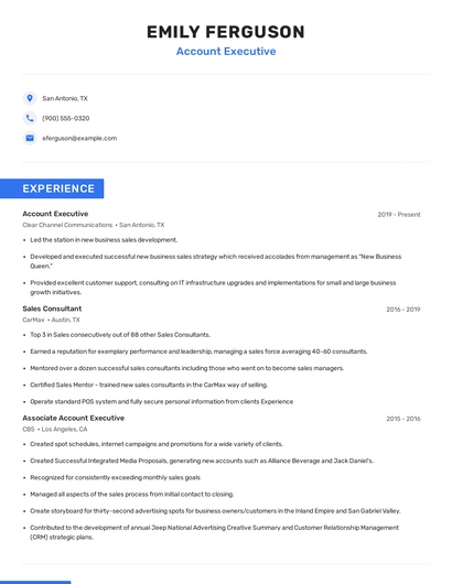 Build a professional account executive resume in minutes. Browse through our resume examples to identify the best way to word your resume. Then choose from 5+ resume templates to create your account executive resume.