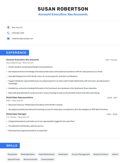Build a professional account executive, key accounts resume in minutes. Browse through our resume examples to identify the best way to word your resume. Then choose from 5+ resume templates to create your account executive, key accounts resume.
