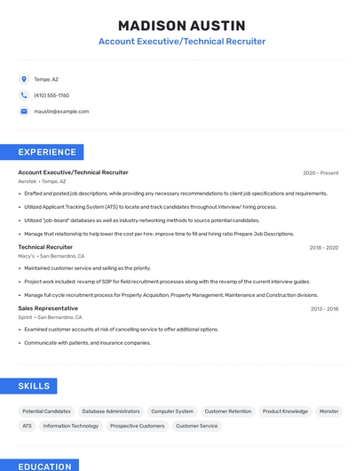 Build a professional account executive/technical recruiter resume in minutes. Browse through our resume examples to identify the best way to word your resume. Then choose from 5+ resume templates to create your account executive/technical recruiter resume.