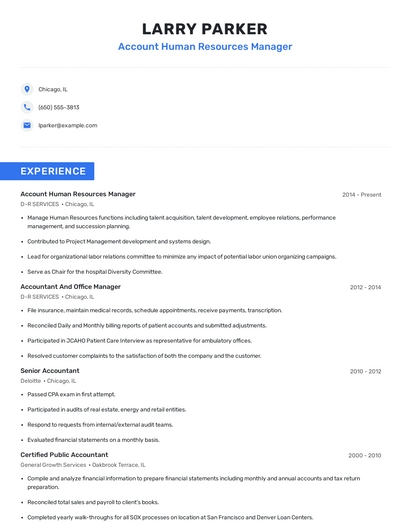 Build a professional account human resources manager resume in minutes. Our AI resume writing assistant will guide you through every step of the process, and you can choose from 10+ resume templates to create your account human resources manager resume.7. QuickBooks
