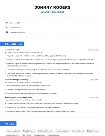 Build a professional account specialist resume in minutes. Browse through our resume examples to identify the best way to word your resume. Then choose from 5+ resume templates to create your account specialist resume.