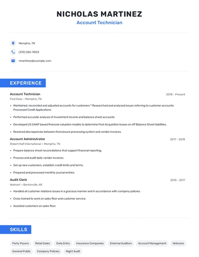 Build a professional account technician resume in minutes. Browse through our resume examples to identify the best way to word your resume. Then choose from 5+ resume templates to create your account technician resume.