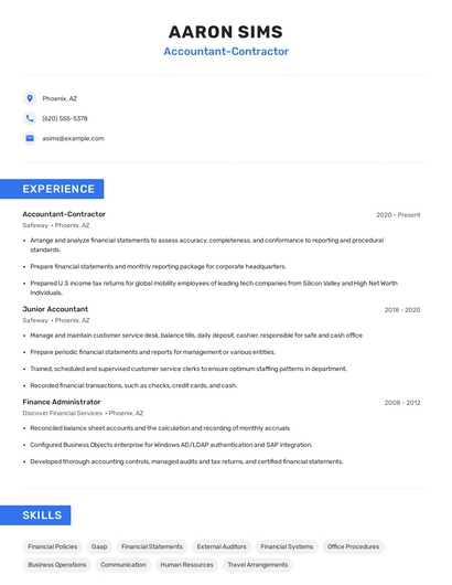 Build a professional accountant-contractor resume in minutes. Browse through our resume examples to identify the best way to word your resume. Then choose from 5+ resume templates to create your accountant-contractor resume.