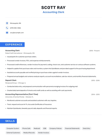 Build a professional accounting clerk resume in minutes. Browse through our resume examples to identify the best way to word your resume. Then choose from 5+ resume templates to create your accounting clerk resume.
