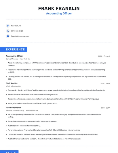 Build a professional accounting officer resume in minutes. Browse through our resume examples to identify the best way to word your resume. Then choose from 5+ resume templates to create your accounting officer resume.