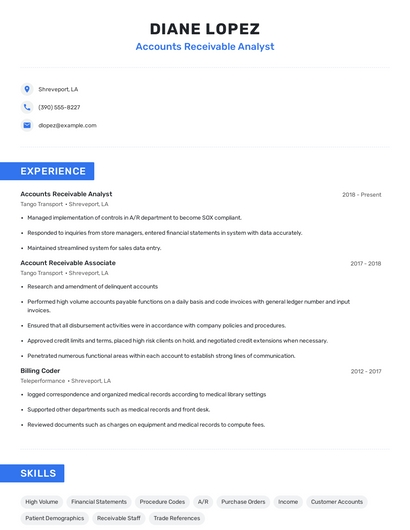 Build a professional accounts receivable analyst resume in minutes. Browse through our resume examples to identify the best way to word your resume. Then choose from 5+ resume templates to create your accounts receivable analyst resume.