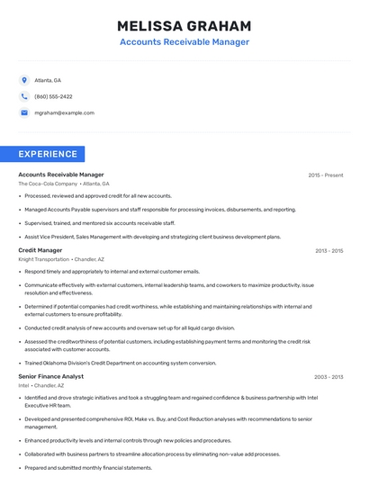 Build a professional accounts receivable manager resume in minutes. Browse through our resume examples to identify the best way to word your resume. Then choose from 5+ resume templates to create your accounts receivable manager resume.
