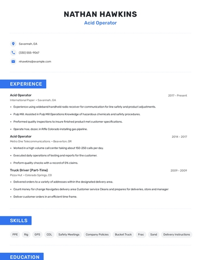 Build a professional acid operator resume in minutes. Our AI resume writing assistant will guide you through every step of the process, and you can choose from 10+ resume templates to create your acid operator resume.7. Log Book