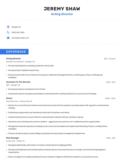 Build a professional acting director resume in minutes. Browse through our resume examples to identify the best way to word your resume. Then choose from 5+ resume templates to create your acting director resume.