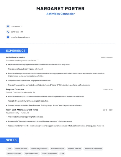 Build a professional activities counselor resume in minutes. Browse through our resume examples to identify the best way to word your resume. Then choose from 5+ resume templates to create your activities counselor resume.