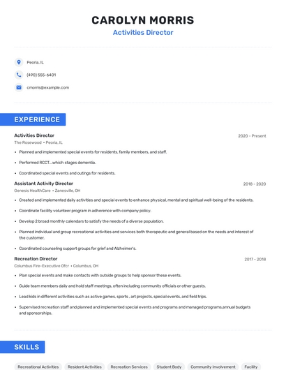 Build a professional activities director resume in minutes. Browse through our resume examples to identify the best way to word your resume. Then choose from 5+ resume templates to create your activities director resume.