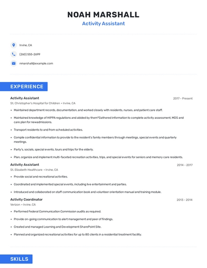 Build a professional activity assistant resume in minutes. Browse through our resume examples to identify the best way to word your resume. Then choose from 5+ resume templates to create your activity assistant resume.