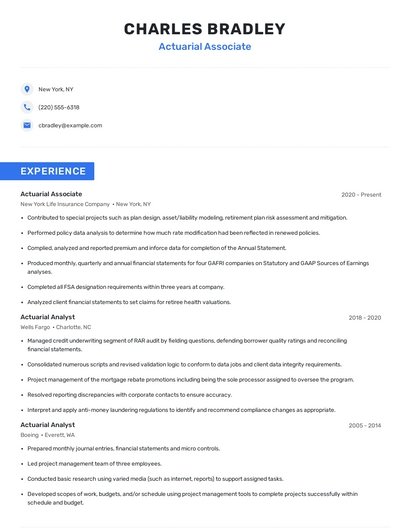 Build a professional actuarial associate resume in minutes. Browse through our resume examples to identify the best way to word your resume. Then choose from 5+ resume templates to create your actuarial associate resume.