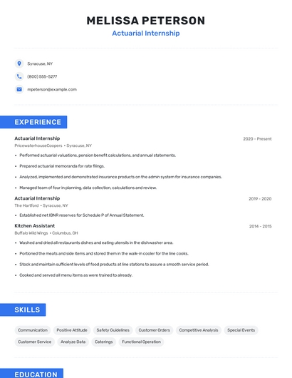 Build a professional actuarial internship resume in minutes. Browse through our resume examples to identify the best way to word your resume. Then choose from 5+ resume templates to create your actuarial internship resume.