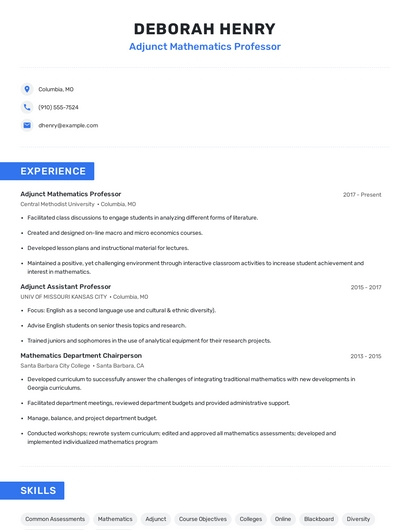 Build a professional adjunct mathematics professor resume in minutes. Browse through our resume examples to identify the best way to word your resume. Then choose from 5+ resume templates to create your adjunct mathematics professor resume.