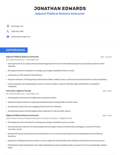 Build a professional adjunct political science instructor resume in minutes. Browse through our resume examples to identify the best way to word your resume. Then choose from 5+ resume templates to create your adjunct political science instructor resume.