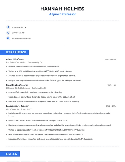 Build a professional adjunct professor resume in minutes. Browse through our resume examples to identify the best way to word your resume. Then choose from 5+ resume templates to create your adjunct professor resume.