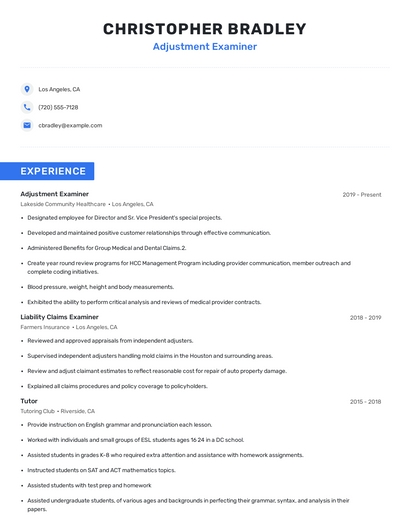 Build a professional adjustment examiner resume in minutes. Our AI resume writing assistant will guide you through every step of the process, and you can choose from 10+ resume templates to create your adjustment examiner resume.What skills help Adjustment Examiners find jobs?