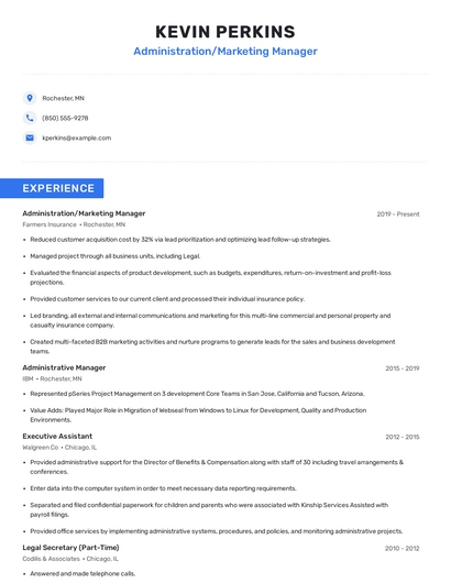 Build a professional administration/marketing manager resume in minutes. Browse through our resume examples to identify the best way to word your resume. Then choose from 5+ resume templates to create your administration/marketing manager resume.