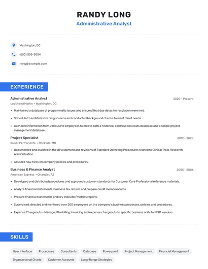 Build a professional administrative analyst resume in minutes. Browse through our resume examples to identify the best way to word your resume. Then choose from 5+ resume templates to create your administrative analyst resume.