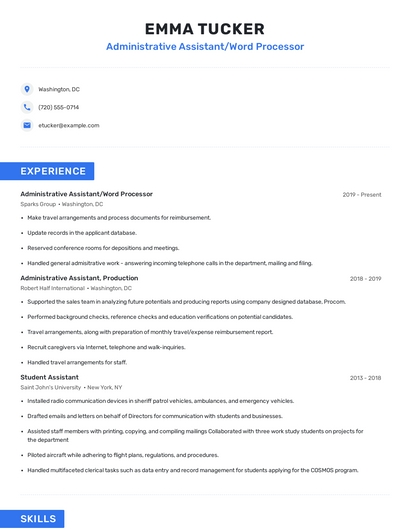 Build a professional administrative assistant/word processor resume in minutes. Browse through our resume examples to identify the best way to word your resume. Then choose from 5+ resume templates to create your administrative assistant/word processor resume.