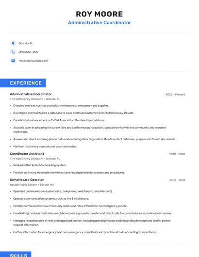 Build a professional administrative coordinator resume in minutes. Browse through our resume examples to identify the best way to word your resume. Then choose from 5+ resume templates to create your administrative coordinator resume.