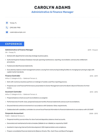 Build a professional administrative & finance manager resume in minutes. Browse through our resume examples to identify the best way to word your resume. Then choose from 5+ resume templates to create your administrative & finance manager resume.