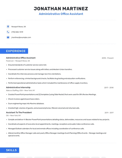 Build a professional administrative office assistant resume in minutes. Browse through our resume examples to identify the best way to word your resume. Then choose from 5+ resume templates to create your administrative office assistant resume.