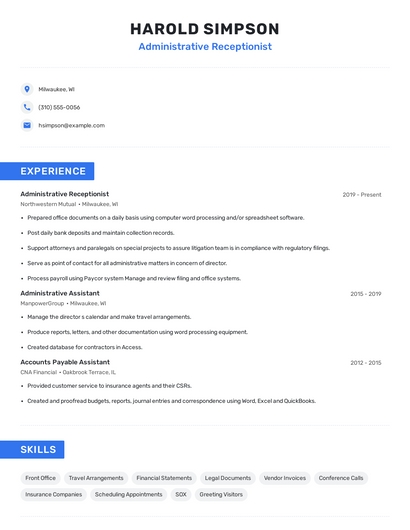 Build a professional administrative receptionist resume in minutes. Browse through our resume examples to identify the best way to word your resume. Then choose from 5+ resume templates to create your administrative receptionist resume.