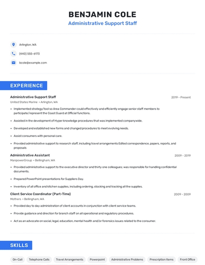 Build a professional administrative support staff resume in minutes. Browse through our resume examples to identify the best way to word your resume. Then choose from 5+ resume templates to create your administrative support staff resume.