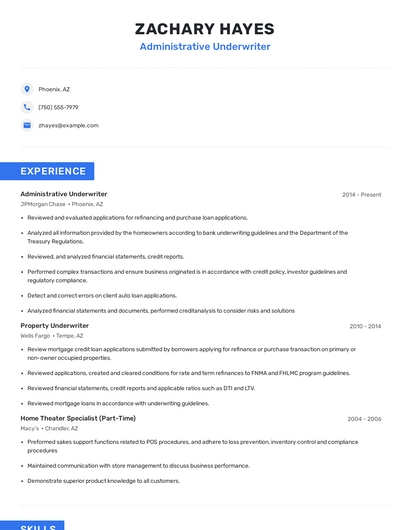 Build a professional administrative underwriter resume in minutes. Our AI resume writing assistant will guide you through every step of the process, and you can choose from 10+ resume templates to create your administrative underwriter resume.What skills help Administrative Underwriters find jobs?