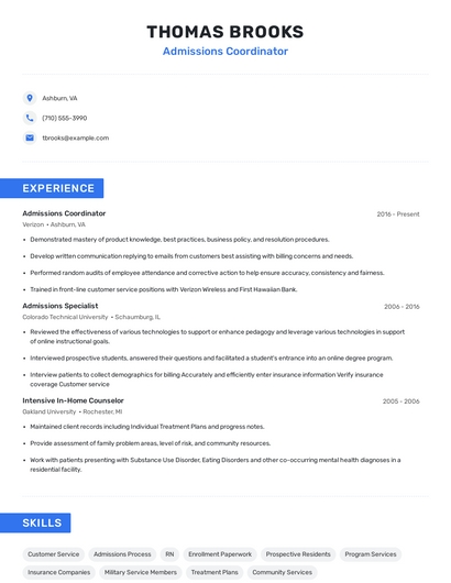 Build a professional admissions coordinator resume in minutes. Browse through our resume examples to identify the best way to word your resume. Then choose from 5+ resume templates to create your admissions coordinator resume.