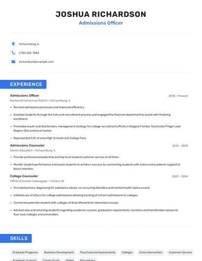 Build a professional admissions officer resume in minutes. Browse through our resume examples to identify the best way to word your resume. Then choose from 5+ resume templates to create your admissions officer resume.