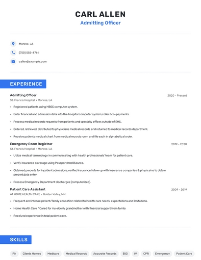 Build a professional admitting officer resume in minutes. Browse through our resume examples to identify the best way to word your resume. Then choose from 5+ resume templates to create your admitting officer resume.