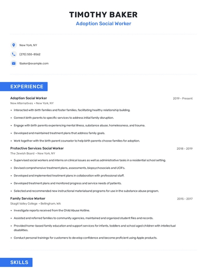 Build a professional adoption social worker resume in minutes. Browse through our resume examples to identify the best way to word your resume. Then choose from 5+ resume templates to create your adoption social worker resume.