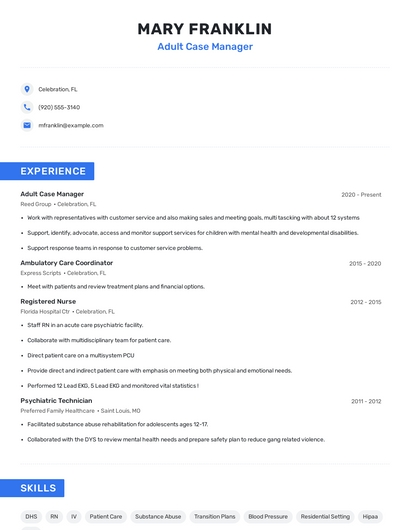 Build a professional adult case manager resume in minutes. Browse through our resume examples to identify the best way to word your resume. Then choose from 5+ resume templates to create your adult case manager resume.