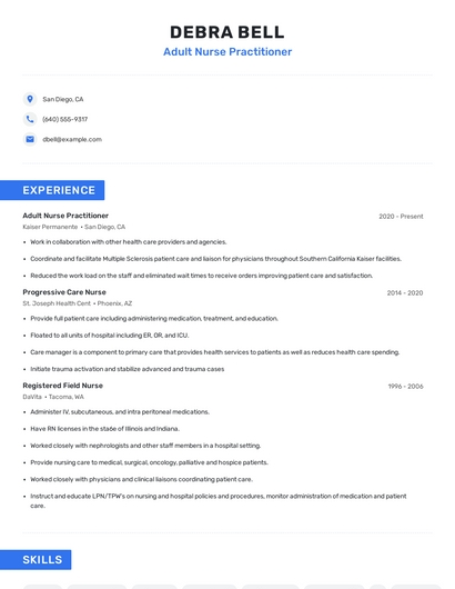 Build a professional adult nurse practitioner resume in minutes. Browse through our resume examples to identify the best way to word your resume. Then choose from 5+ resume templates to create your adult nurse practitioner resume.