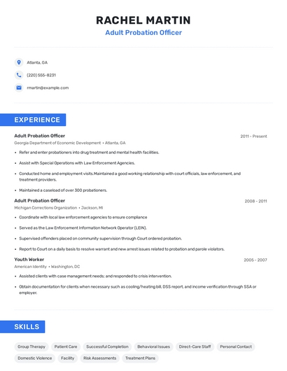 Build a professional adult probation officer resume in minutes. Browse through our resume examples to identify the best way to word your resume. Then choose from 5+ resume templates to create your adult probation officer resume.