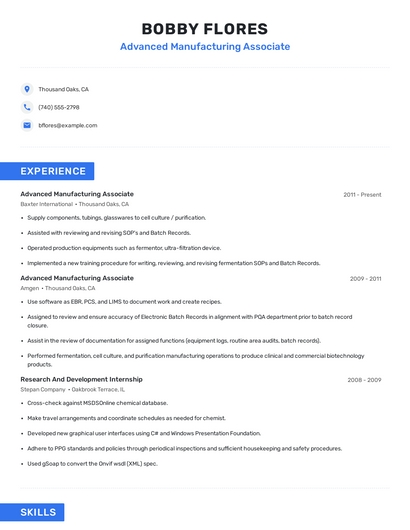 Build a professional advanced manufacturing associate resume in minutes. Browse through our resume examples to identify the best way to word your resume. Then choose from 5+ resume templates to create your advanced manufacturing associate resume.