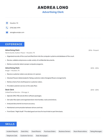 The most important skills for an advertising clerk resume and required skills for an advertising clerk to have include: