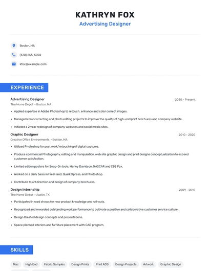 Build a professional advertising designer resume in minutes. Browse through our resume examples to identify the best way to word your resume. Then choose from 5+ resume templates to create your advertising designer resume.